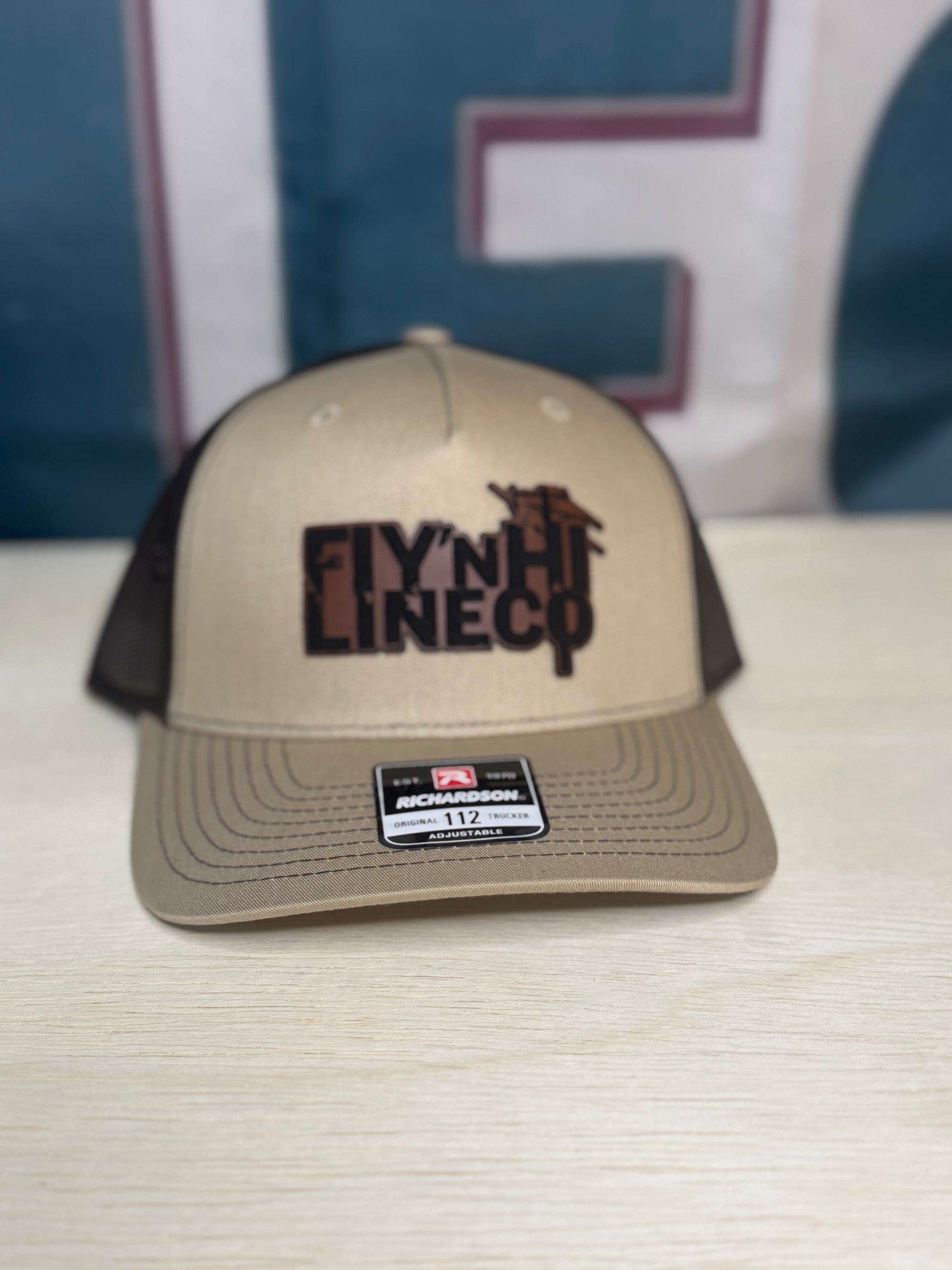 Richardson 112 trucker hat with khaki front and dark brown leather etched patch