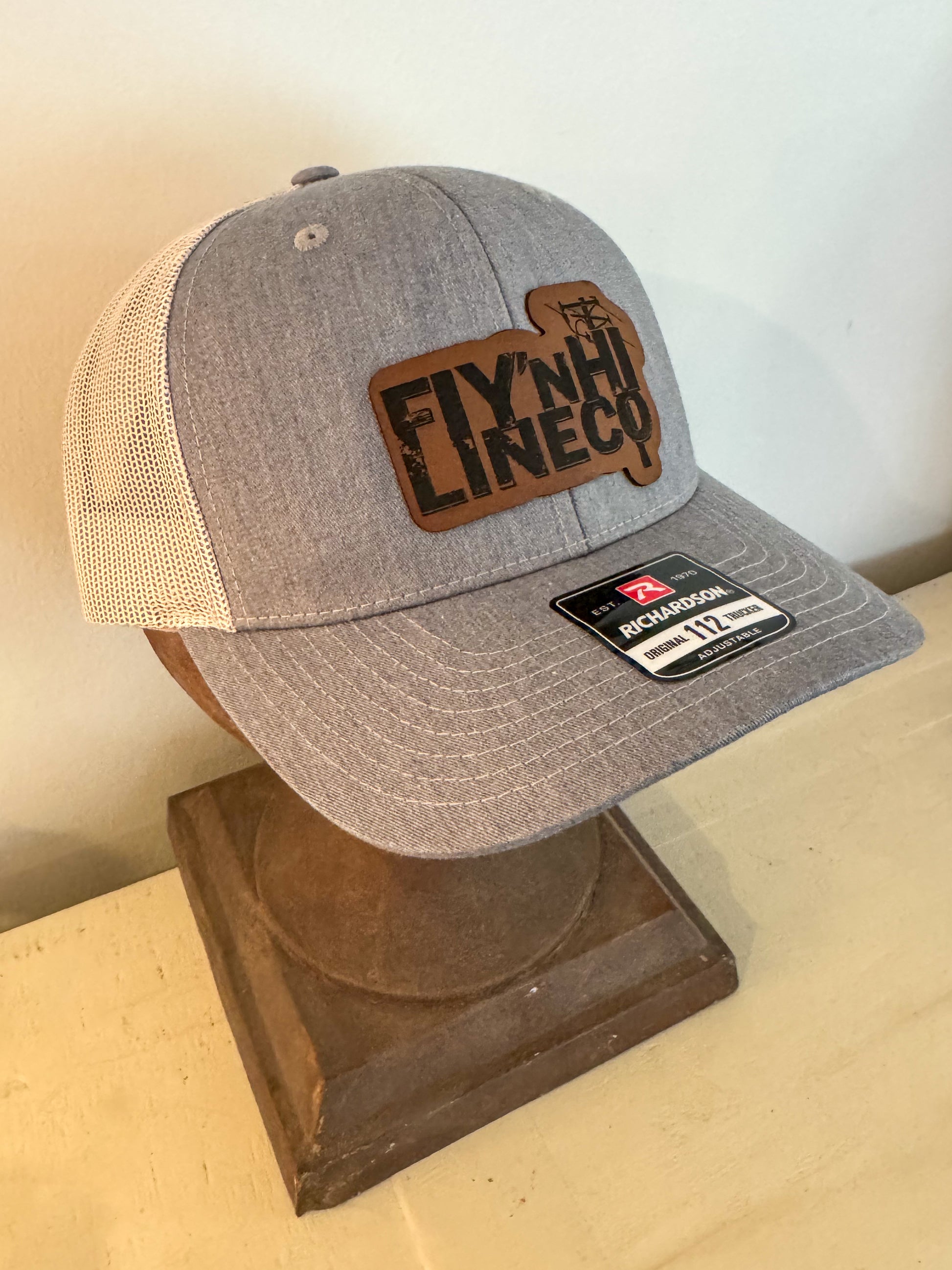 Richardson 112 6 panel trucker hat with a die cut leather patch